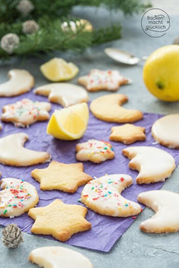 - Für den Guss Zitronensaft und Puderzucker sehr gut zu einer zähen Masse verrühren; die Zitronensaftmenge evtl etwas verringern oder vergrößern. Auf die Kekse streichen, nach Belieben mit Zuckerstreuseln dekorieren und trocknen lassen.